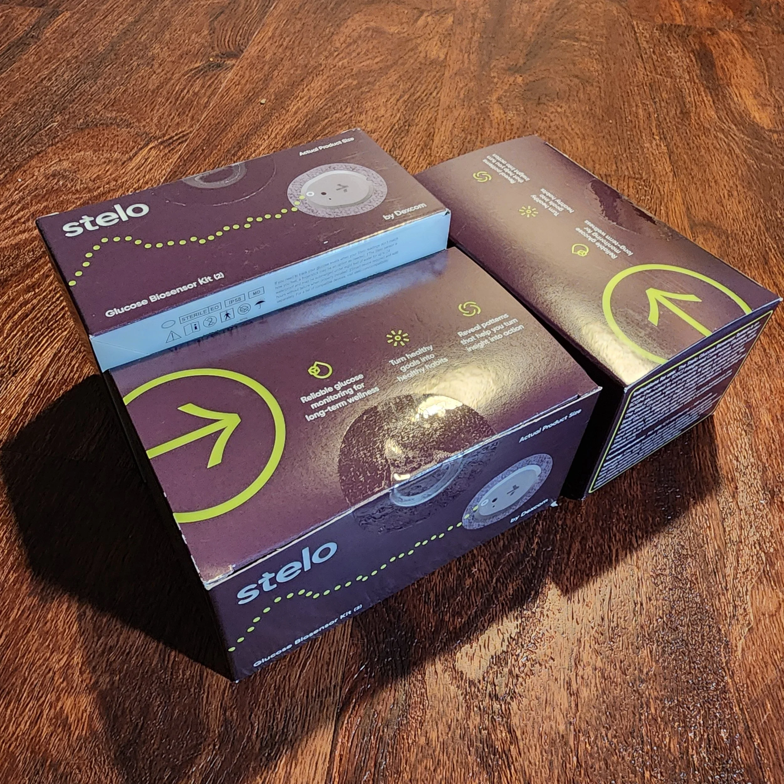 Three month supply boxes of Dexcom Stelo (an over the counter continuous glucose monitor) on a cherry plank vinyl background